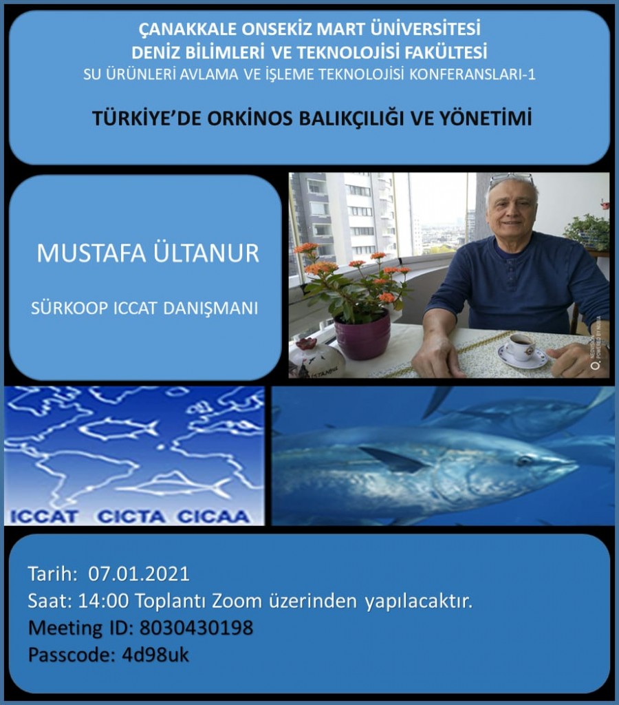 Fakültemiz Su Ürünleri Avlama ve İşleme Teknolojisi Bölümü tarafından düzenlenen Aralık ayı konferansları kapsamında SÜRKOOP ICCAT Danışmanı Mustafa ÜLTANUR "Türkiye'de Orkinos Balıkçılığı ve Yönetimi" ile ilgili bilgiler verecektir. 07.01.2021 tarihi, saat 14:00 gerçekleştirilecek olan konferansa akademisyenlerimiz, öğrencilerimiz ve konuya ilgi duyan herkes davetlidir.